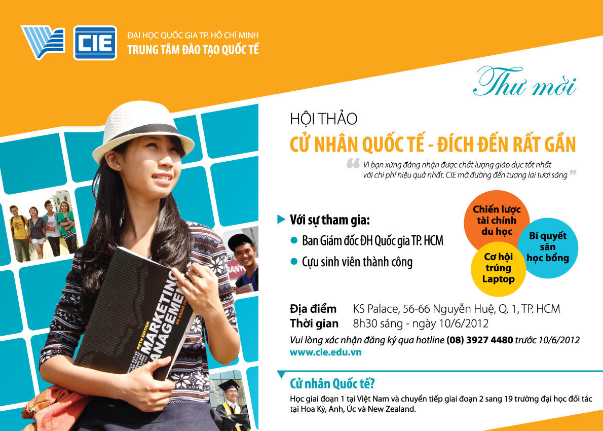 Buổi Hội thảo Cử nhân Quốc tế Hoa Kỳ/Anh/Úc/New Zealand sẽ được Trung tâm Đào tạo Quốc tế (CIE)- Đại Học Quốc Gia TP.HCM tổ chức vào ngày 10/6/2012 hứa hẹn sẽ mang lại nhiều thông tin hữu ích cho những ai đang ấp ủ ước mơ đi du học và được học tập trong môi trường quốc tế.